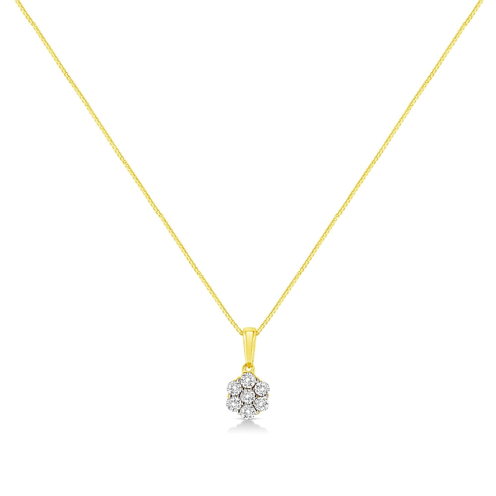 Add a floral touch to your everyday jewelry wear with this chic 1/4 cttw diamond cluster pendant. This necklace boasts 7 natural, round-cut diamonds in a flower motif that is created in genuine 14k Yellow Gold. The pendant hangs off of a 14k Yellow Gold 18" box chain. Add this flower piece to your jewelry collection to elevate all your outfits.